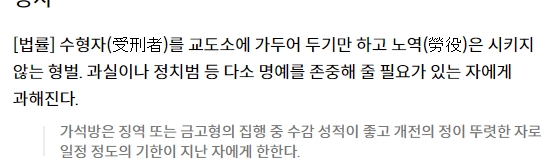 또한 자신의 신념 때문에 국가에 반대하는 행동을 한 정치범의 경우에도 금고형을 선고하기도 해요. 이건 죄를 짓긴 했지만, 나쁜 마음으로 한 게 아니라는 점을 생각해서 힘든 강제 노동은 시키지 않는 거라고 볼 수 있어요.