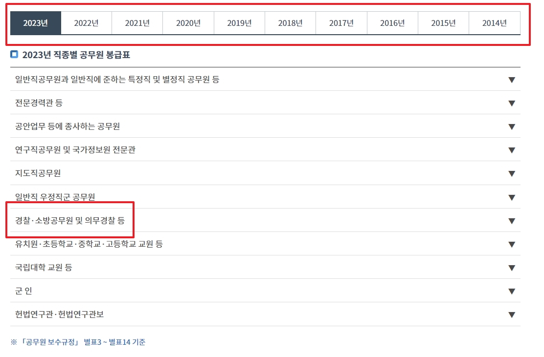 연도를 선택한 후에는 아래에 있는 여러 봉급표 종류 중에서 경찰/소방공무원 및 의무경찰 등이라고 적힌 부분을 클릭해야 합니다. 그래야 우리가 궁금해하는 경찰의 월급 정보를 정확하게 볼 수 있습니다.