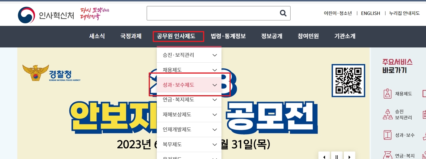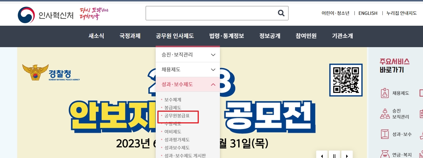 홈페이지에 성공적으로 들어오셨다면, 이제 봉급표를 찾아가야겠죠. 화면 위쪽을 보시면 여러 메뉴들이 있는데, 그중에서 '공무원 인사제도'라는 글자를 찾아서 눌러주세요.