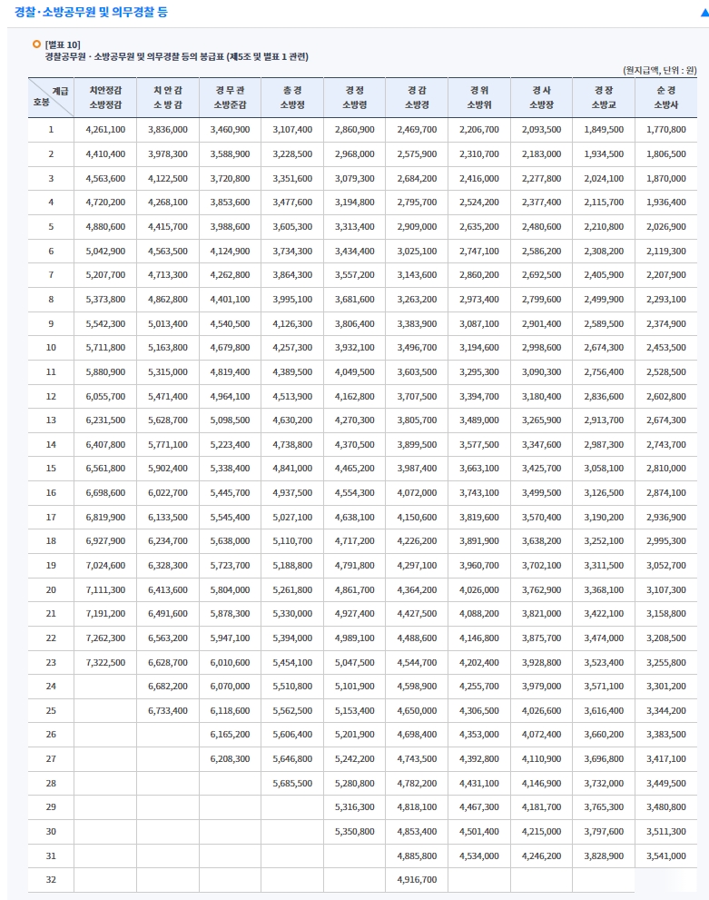 그리고 같은 1호봉을 기준으로 계급이 올라갈수록 월급도 오르는 것을 확인할 수 있습니다. 경장 1호봉은 약 185만원, 경사 1호봉은 약 210만원 정도 되는군요.