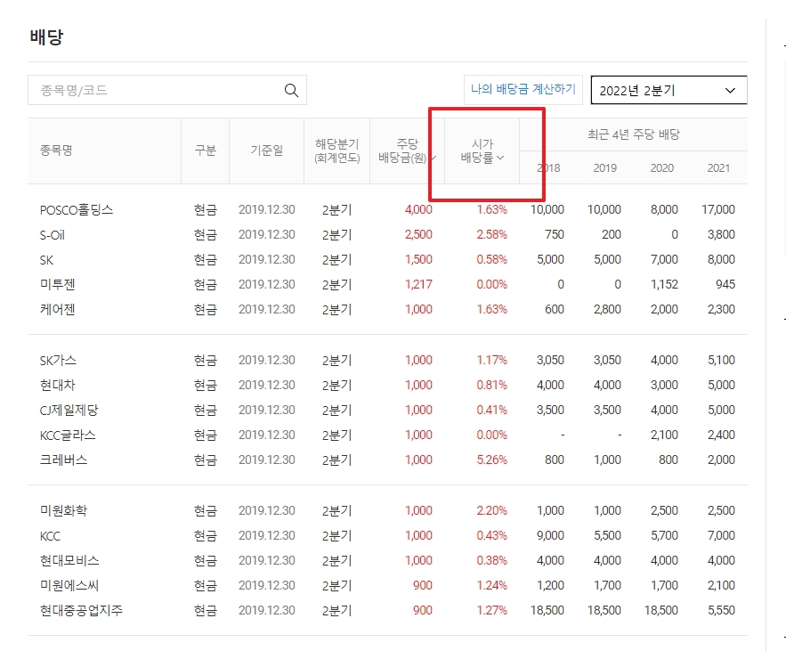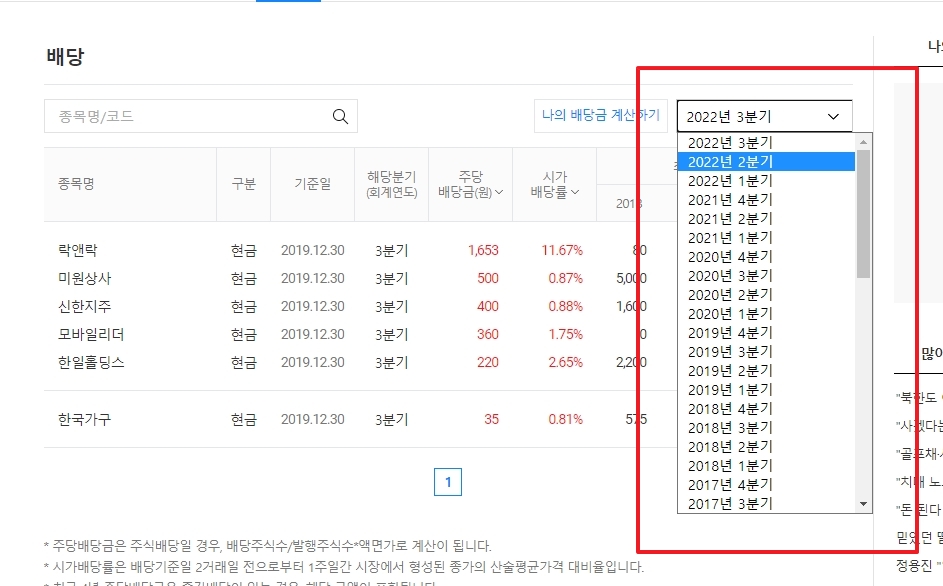 배당 페이지로 이동하면 이제 거의 다 왔습니다. 오른쪽 위를 보시면 기준이 되는 년도와 분기를 선택할 수 있는 부분이 있어요. 정확한 비교를 위해서는 1년 전체를 기준으로 확인하는 것이 좋지만, 여기서는 예시로 2022년 2분기를 선택해서 진행해보겠습니다.
