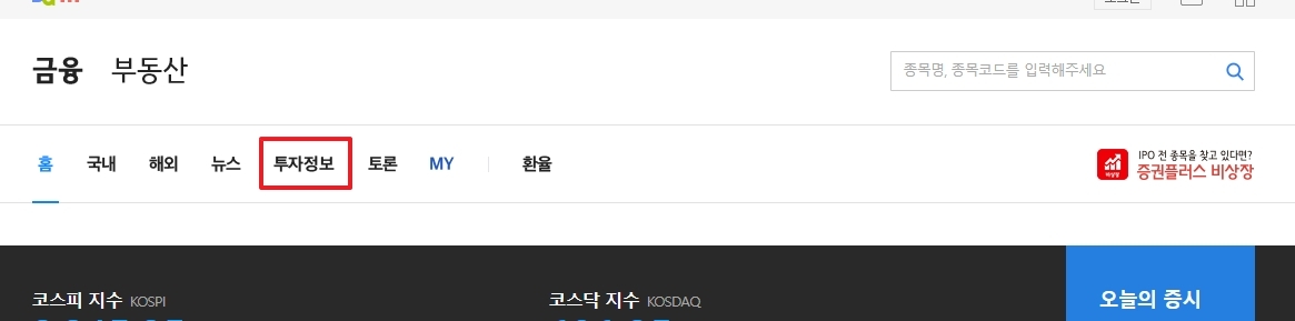 홈페이지에 들어오셨으면 위쪽에 여러 메뉴들이 보일 텐데, 그중에서 국내증시라는 글자를 찾아서 눌러주시면 됩니다. 그러면 우리나라 주식 시장에 대한 다양한 정보들이 있는 페이지로 넘어가게 될 거에요.