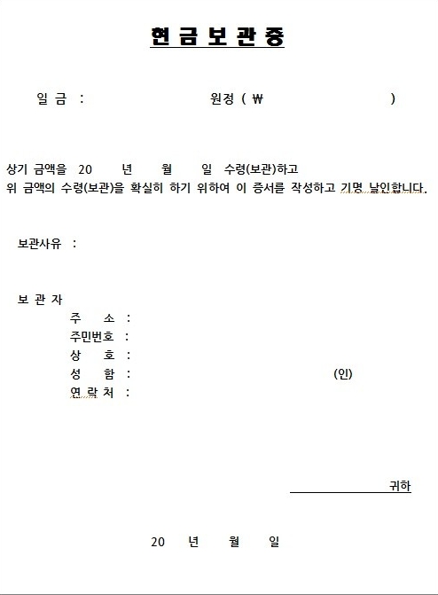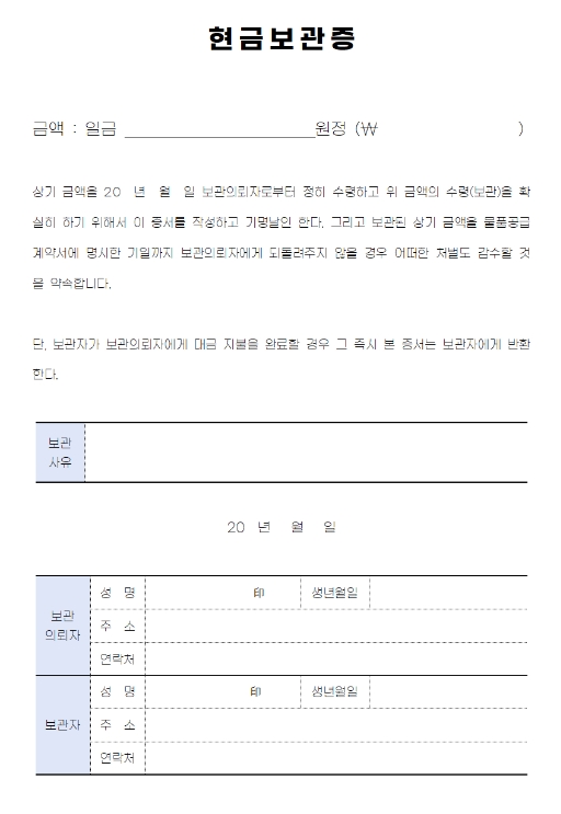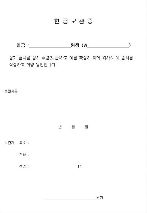 현금보관증은 다른 사람의 돈을 잠시 맡고 있다는 것을 확인해주는 중요한 서류에요. 정해진 양식은 따로 없지만, 인터넷 포털사이트 등에서 검색하면 다양한 서식을 찾아볼 수 있습니다. 중요한 건 금액, 날짜, 맡긴 사람과 맡는 사람의 정보, 그리고 보관하는 이유를 정확하게 적는 것이에요.
