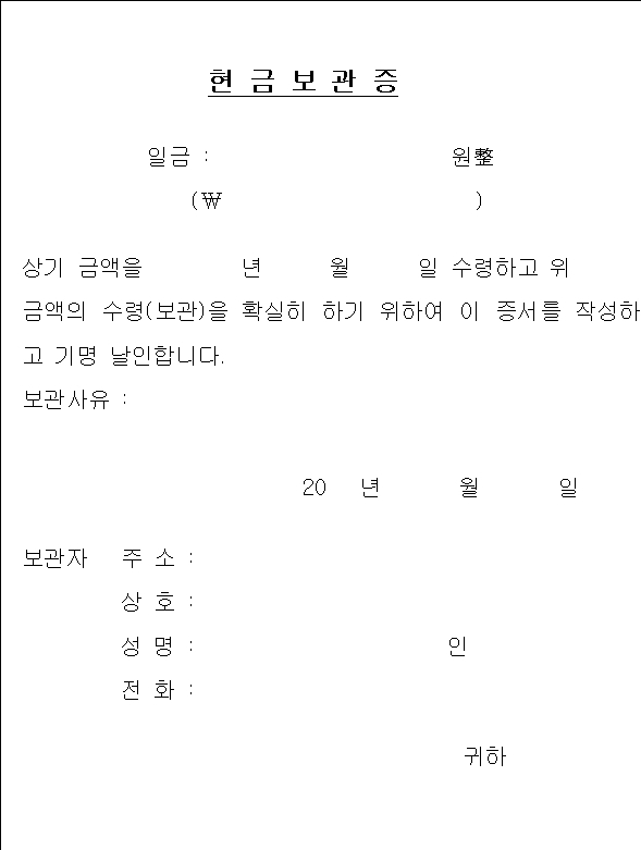 그래서 나중에 문제가 생기지 않으려면 꼭 이런 서류를 작성해두는게 좋아요. 여기 보이는 양식에는 보관할 금액이 얼마인지, 언제부터 언제까지 보관할지, 그리고 어떤 이유로 보관하는지에 대한 내용과 함께 보관하는 사람의 정보를 적는 칸이 있네요.