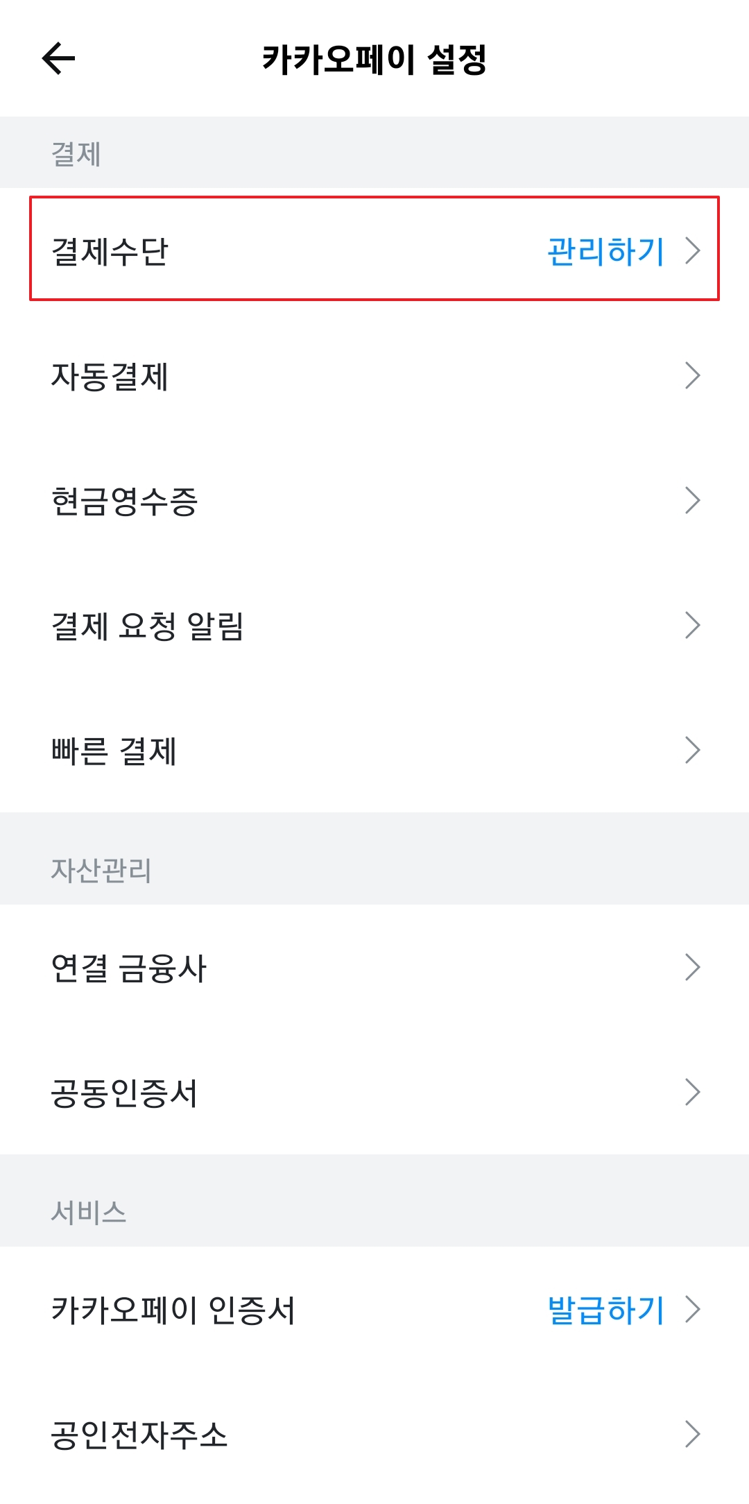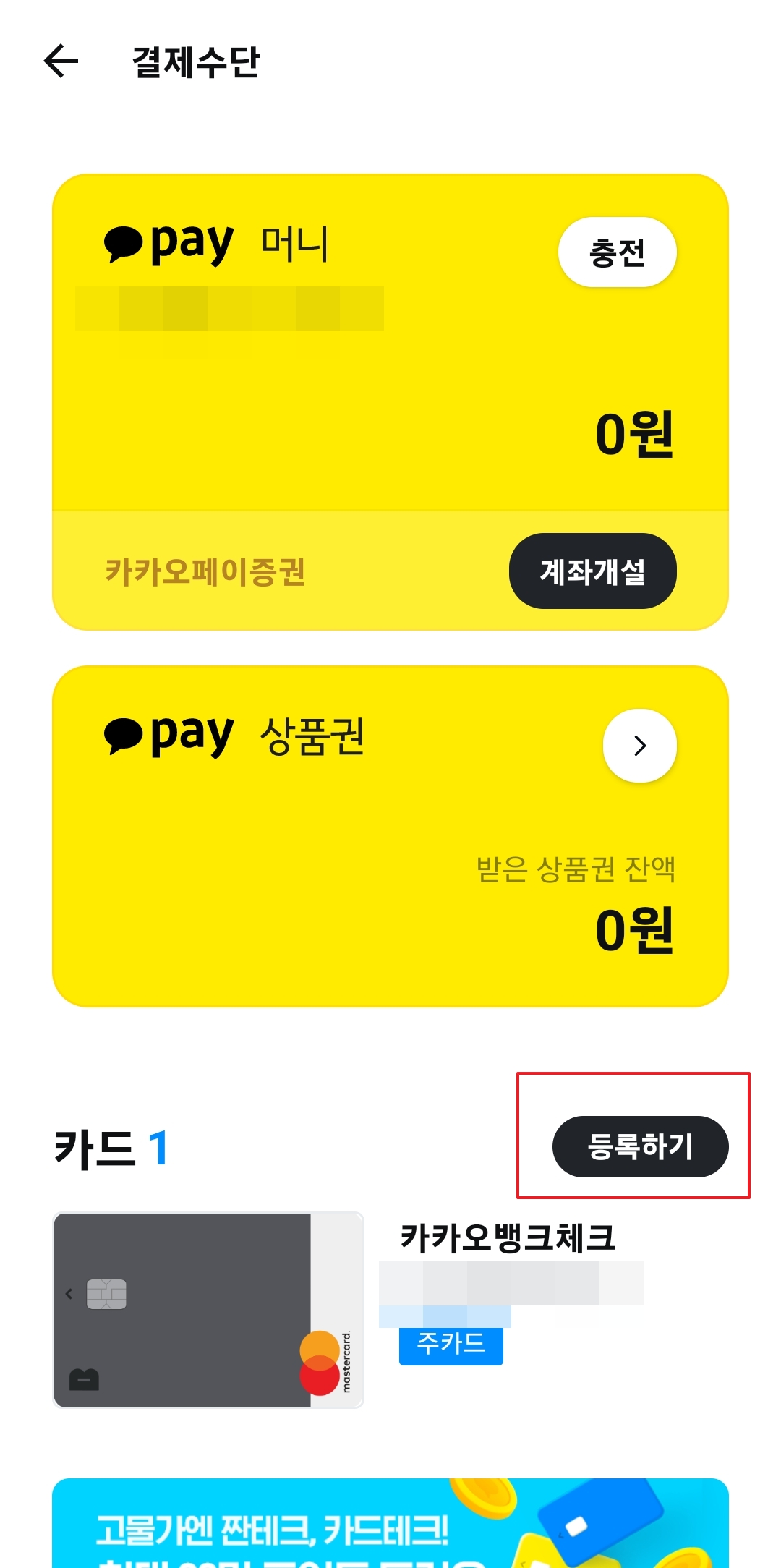 이 메뉴가 바로 페이머니 충전이 아니라, 우리가 평소에 쓰는 신용카드나 체크카드를 등록해서 결제할 때마다 카드에서 바로 돈이 나가게 하는 기능을 설정하는 곳입니다.