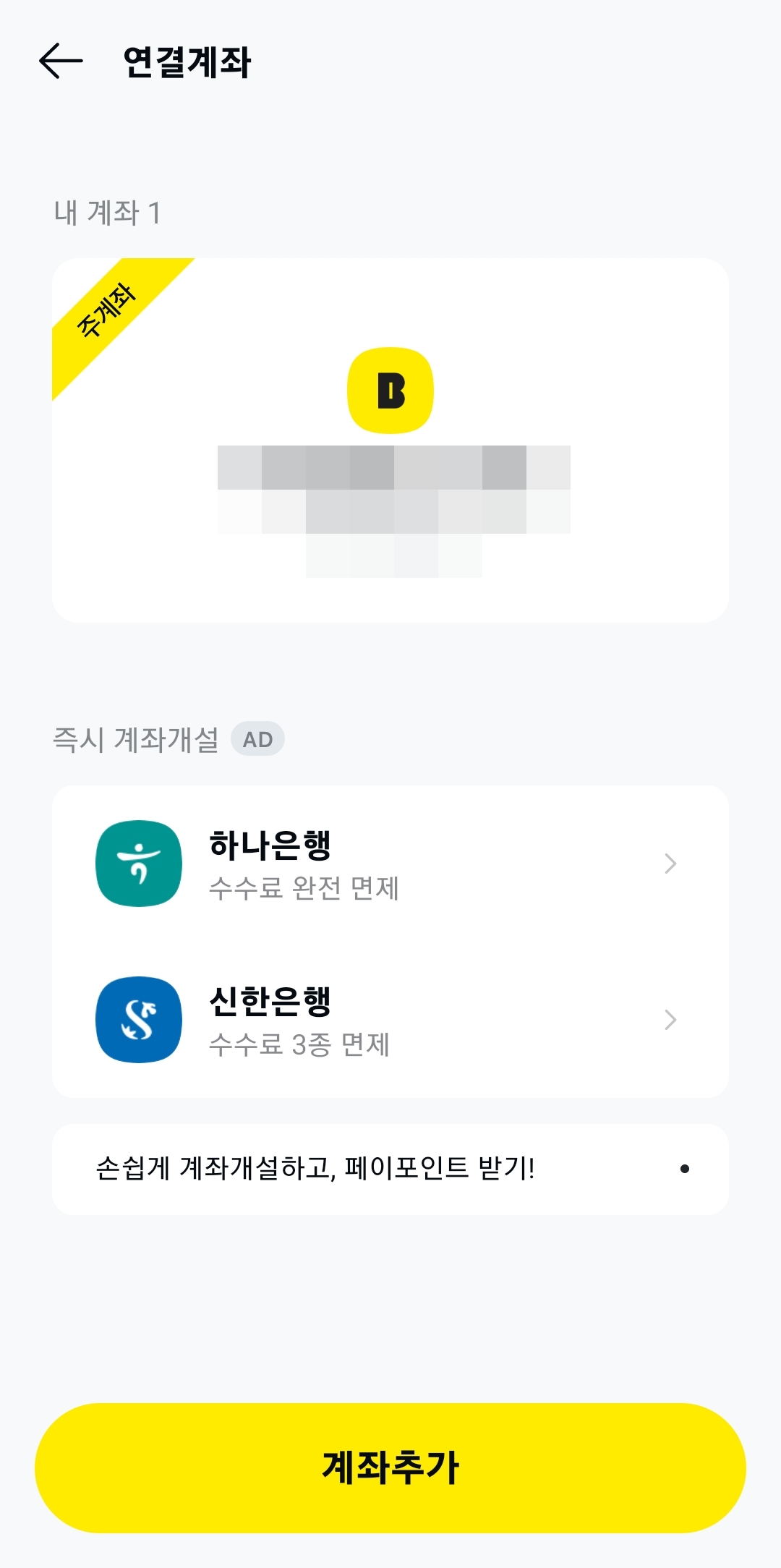 버튼을 누른 뒤에는 본인이 사용하는 은행을 선택하고 계좌번호를 입력하는 등 간단한 인증 절차를 거치면 바로 연결이 완료됩니다. 페이머니를 주로 사용한다면 아주 편리한 기능입니다.