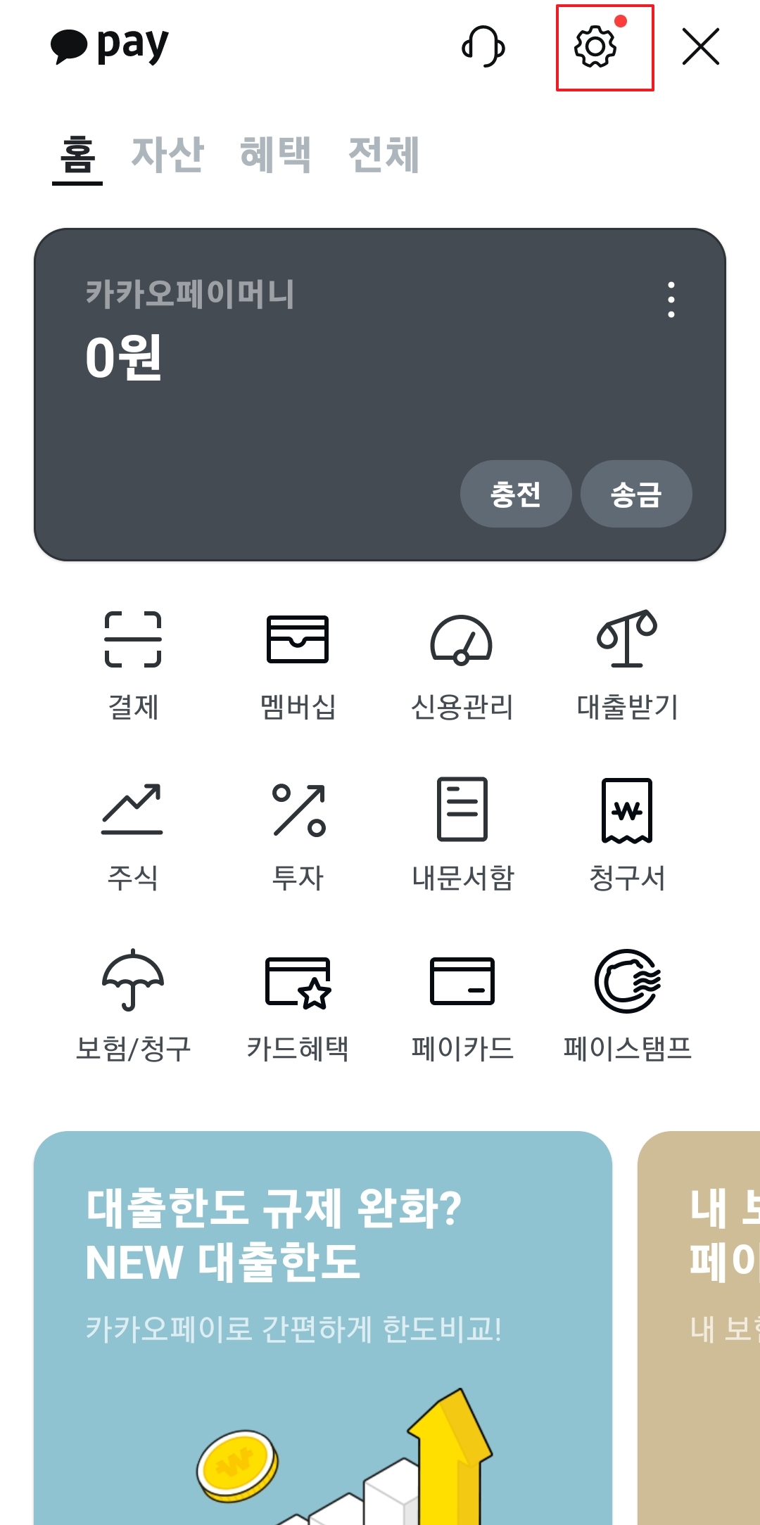 카카오페이 메인 화면으로 잘 넘어오셨나요? 그럼 이제 거의 다 왔습니다. 화면 오른쪽 위에 보면 톱니바퀴 모양의 아이콘이 있는데, 이게 바로 설정 메뉴로 들어가는 버튼입니다. 이 톱니바퀴 모양을 찾아서 눌러주세요.