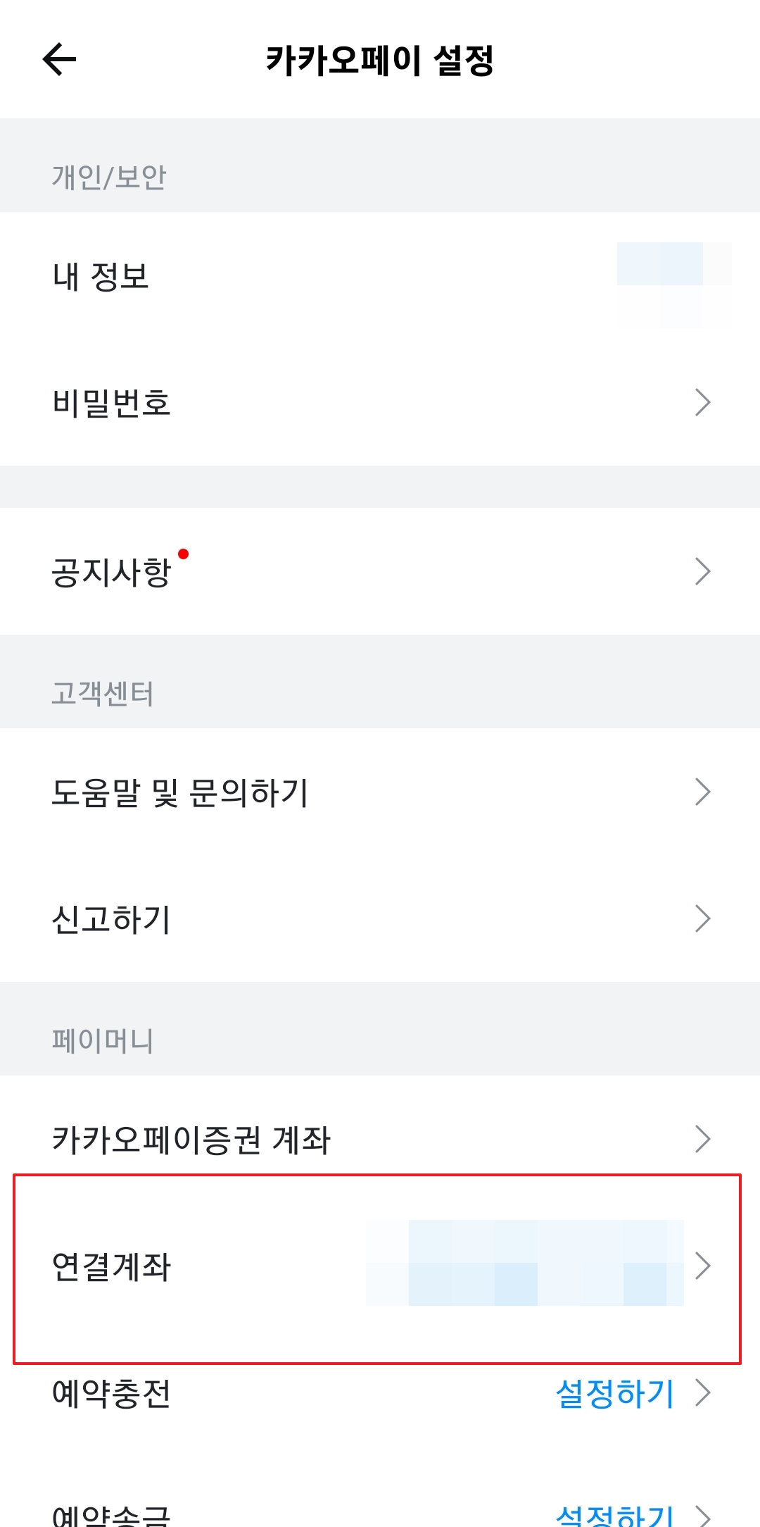 설정 화면으로 들어오면 여러 메뉴들이 보이는데요. 여기서 두 가지 방법을 알아볼 거예요. 첫 번째는 페이머니를 충전할 계좌를 연결하는 방법입니다. 화면을 보면 '페이머니'라는 글자 아래에 '연결계좌'라는 항목이 보일 겁니다. 이 부분을 눌러주세요.