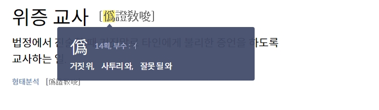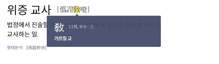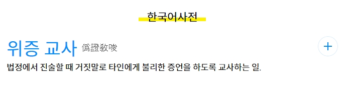 먼저 위증교사의 사전적 의미를 살펴보겠습니다. 포털 사이트의 사전 기능을 활용하여 검색하면, '법률' 분야의 용어임을 알 수 있습니다. 그 뜻은 증인에게 거짓된 증언을 하도록 꾀거나 부추기는 행위를 말하는데요.