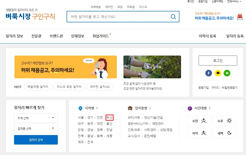 구인구직 페이지로 들어왔다면, 원하는 일자리를 찾기 위해 지역을 선택해야 합니다. 우리는 부산 지역의 일자리를 찾고 있으므로, 지역별 검색에서 '부산'을 선택합니다. 만약 특정 동네의 일자리를 원한다면 강서구, 금정구, 기장군 등 세부 지역을 추가로 선택하여 검색 범위를 좁힐 수도 있습니다.