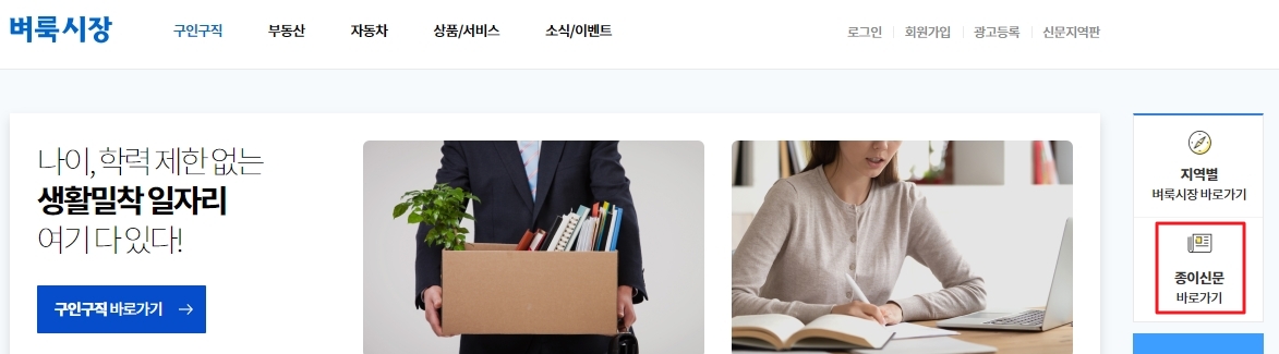 종이신문의 익숙한 형태 그대로 구인 정보를 보고 싶다면, 벼룩시장 메인 화면에서 '종이신문 바로가기'를 찾아 선택하면 됩니다. 여러 지역 신문이 나오는데, 그중에서 '경남/부산' 권역을 찾아 '부산'을 클릭해 주세요.