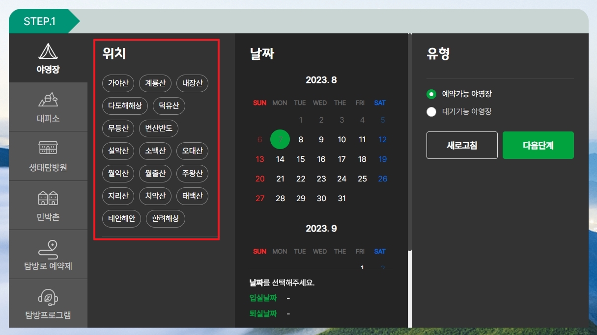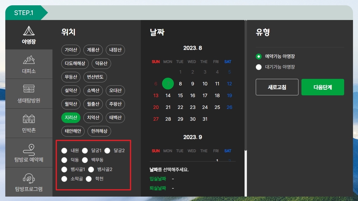 산을 고르고 나면 그 아래에 해당 공원에 속한 세부 야영장 위치를 고르는 메뉴가 활성화됩니다. 내가 가려는 곳의 이름이 맞는지 다시 한번 꼼꼼하게 확인하는 것이 중요합니다.