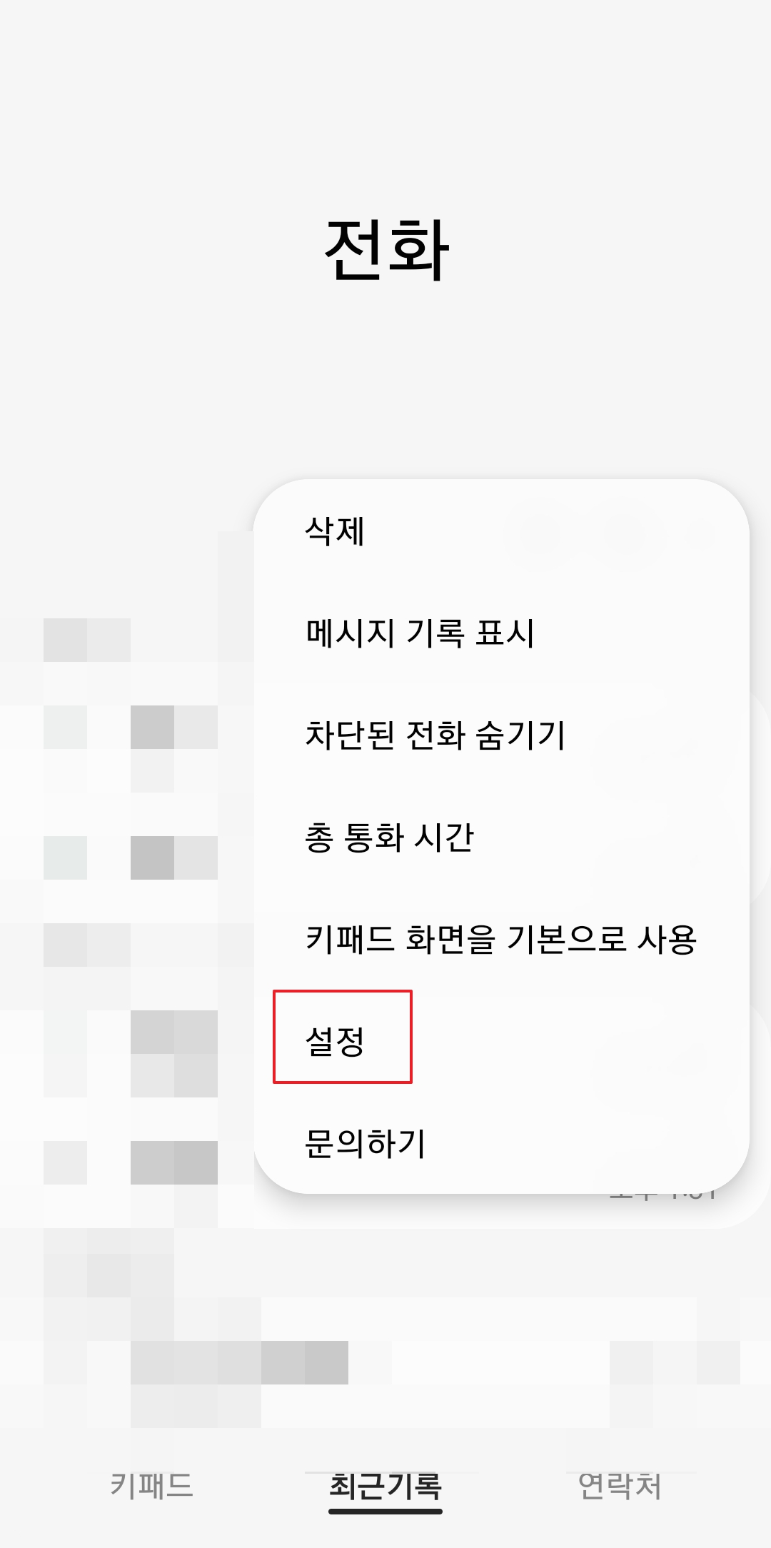 이번에는 차단된 번호들을 관리하는 방법을 알아보겠습니다. 다시 통화 기록 화면으로 돌아가서, 오른쪽 위에 있는 점 세 개 모양의 '더보기' 메뉴를 누른 후 나타나는 목록에서 '설정'으로 들어가 주세요. 이곳에서 통화와 관련된 다양한 고급 설정들을 변경할 수 있습니다.