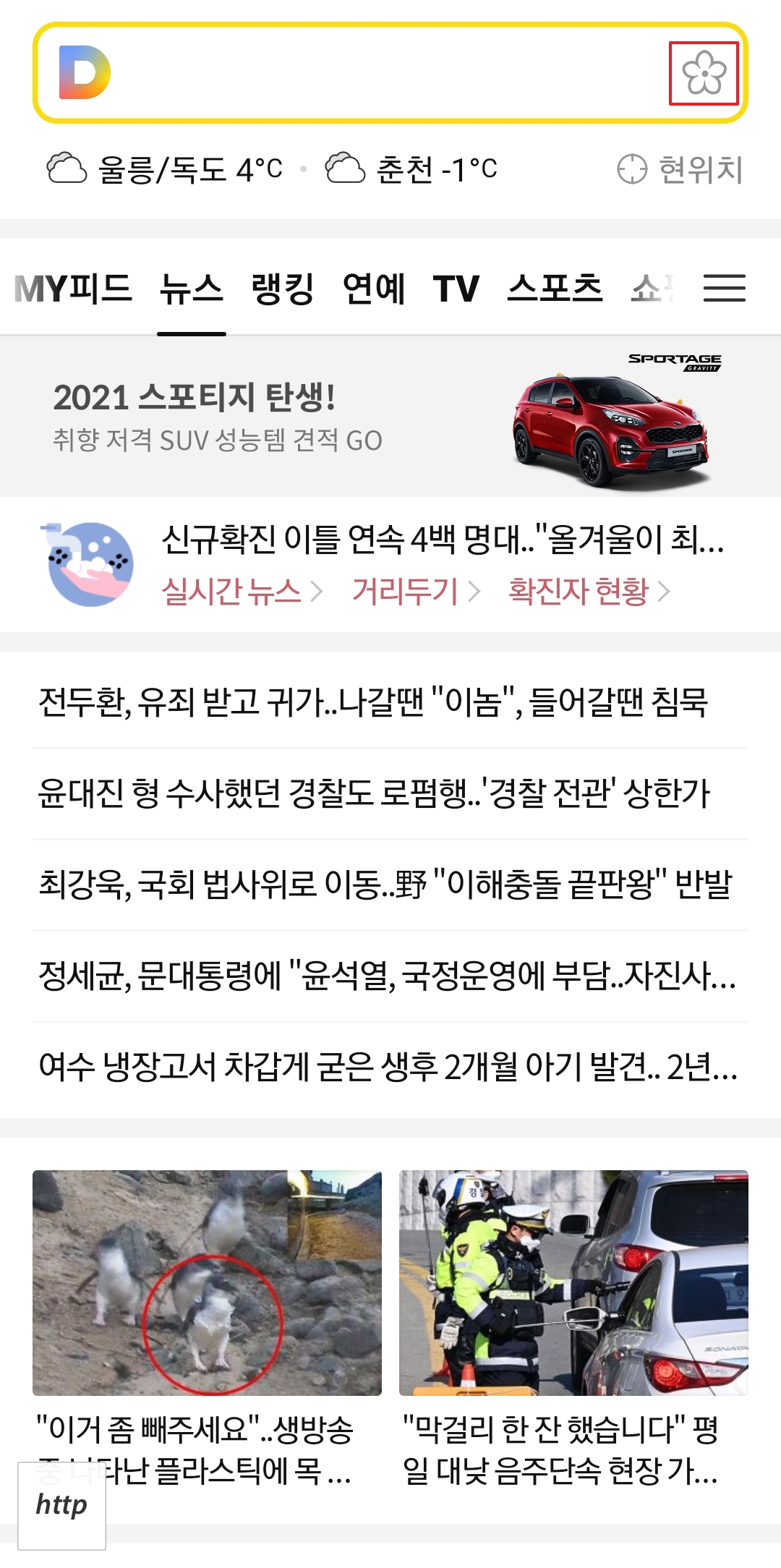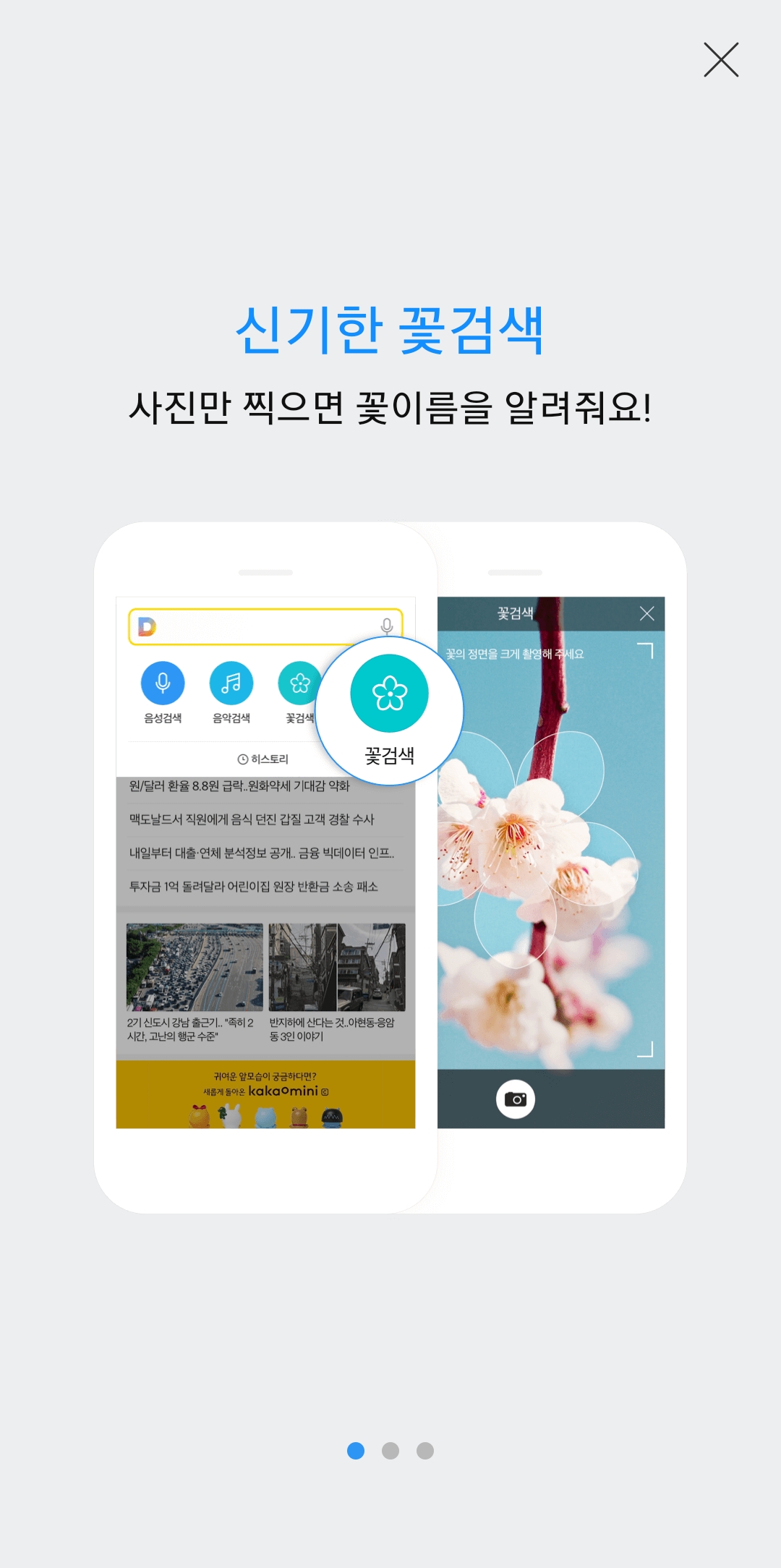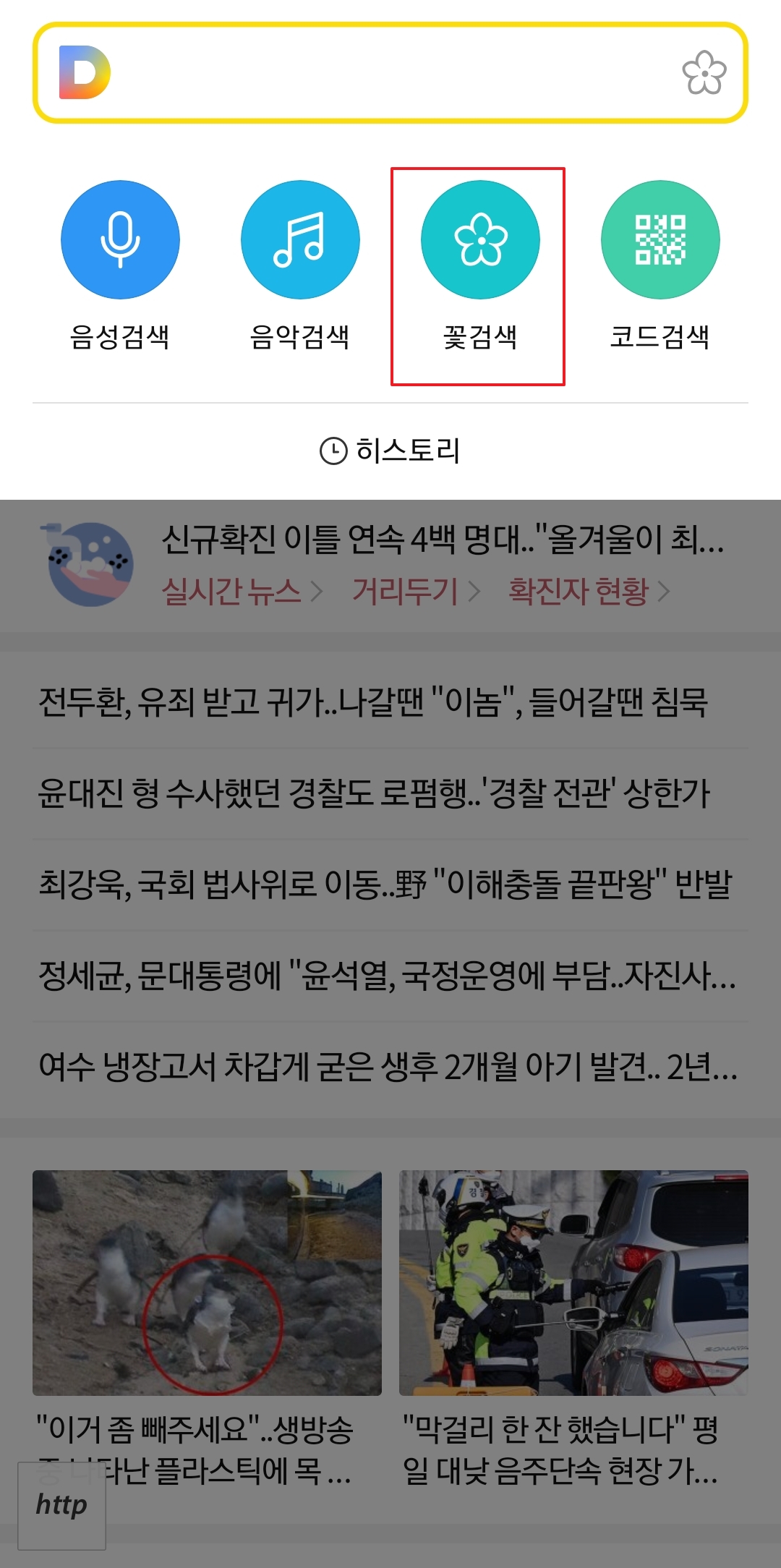 다음 어플 메인 화면의 검색창을 자세히 살펴보세요. 오른쪽에 마이크 아이콘과 함께 꽃 모양의 아이콘이 보일 것입니다. 이 꽃 아이콘을 터치하면 여러 메뉴가 나타나는데, 그중에서 '꽃검색'이라고 적힌 메뉴를 선택하면 됩니다.