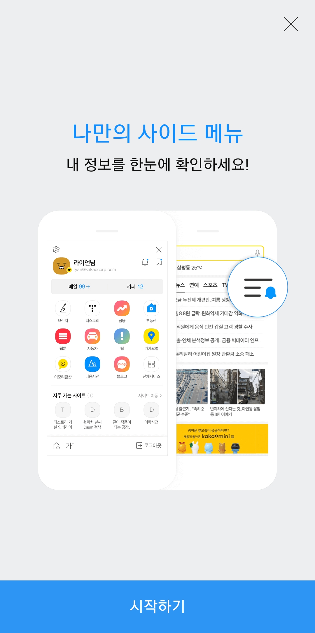 어플을 처음 실행하면 몇 가지 안내 화면이 나타납니다. 화면의 안내에 따라 넘기다 보면 마지막에 '시작하기' 버튼이 보입니다. 이 버튼을 눌러 초기 설정을 마치고 나면, 다음 어플의 메인 화면으로 이동하게 됩니다.