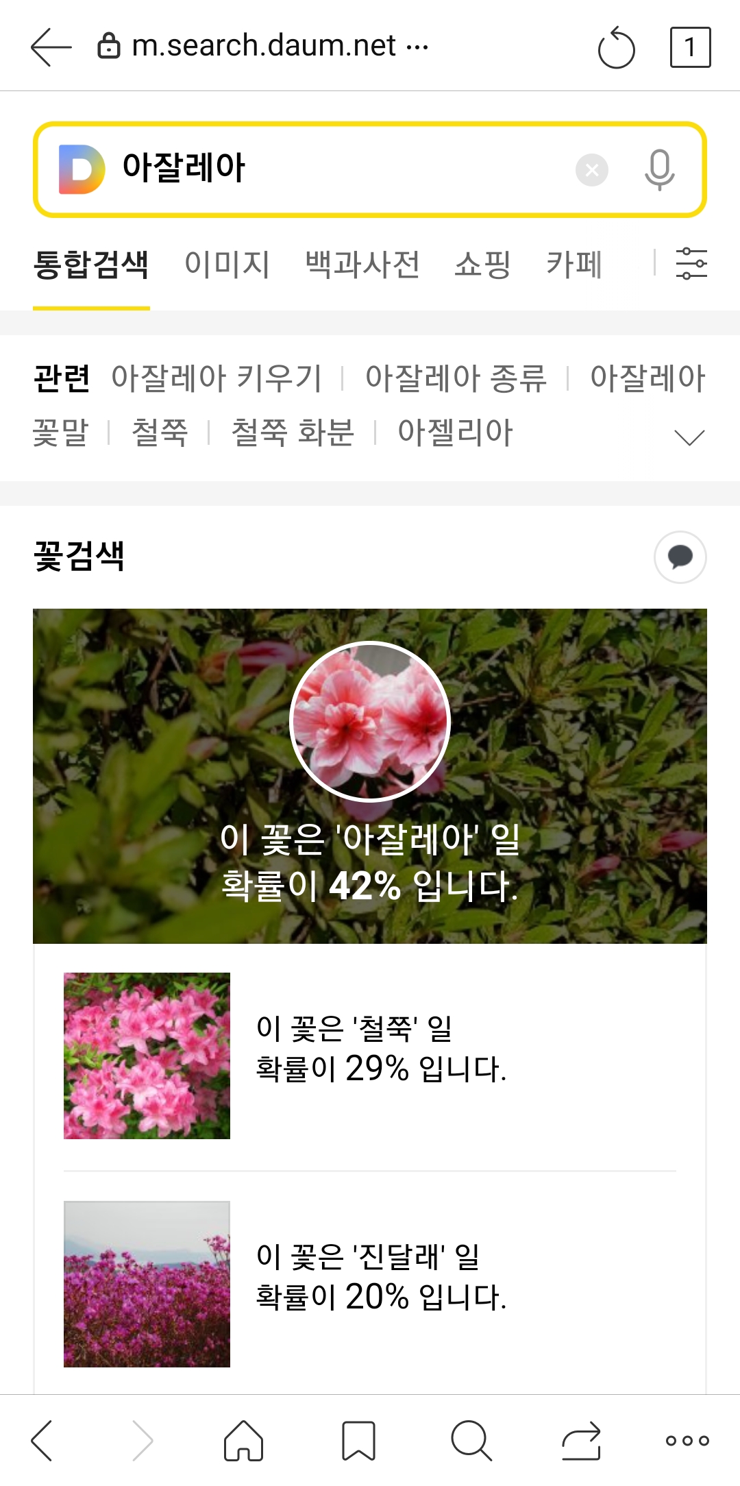 사진 촬영을 완료하면 어플이 잠시 이미지를 분석합니다. 분석이 끝나면 화면에 보이는 것처럼 가장 닮은 꽃 순서대로 결과를 보여줍니다. 예를 들어 '아잘레아 42%', '철쭉 29%'와 같이 후보와 일치율을 함께 제시해주기 때문에, 가장 확률이 높은 이름을 참고하여 실제 꽃과 비교해볼 수 있습니다.