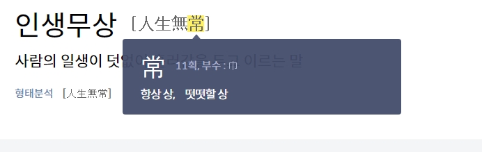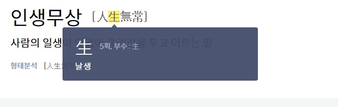 검색창에 '인생무상'을 입력하면 관련 정보가 나타나는데, 이는 '사람의 일생이 덧없이 흘러감'을 의미하는 한자 성어임을 알 수 있습니다. 단순한 허무주의가 아니라 삶의 유한함을 깨닫게 해주는 말입니다.