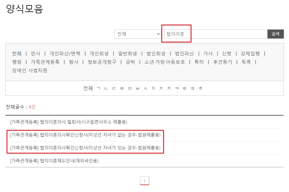 양식모음 페이지에 들어왔다면 검색창을 활용하는 것이 가장 효율적입니다. 검색창에 '협의이혼'이라고 입력하고 검색 버튼을 누르면, 관련된 모든 서류 목록이 나타납니다. 다른 서류들과 헷갈리지 않도록 정확한 명칭을 확인하는 것이 좋습니다.