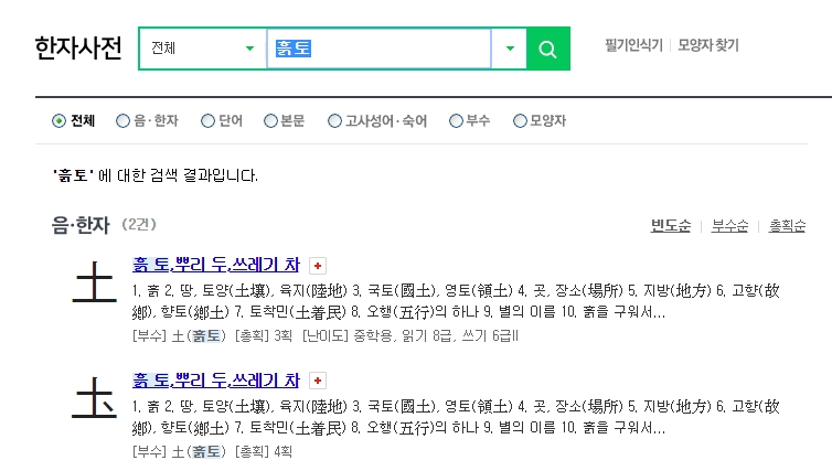 {"alt":"한자의 훈과 음인 '흙 토'를 직접 검색창에 입력하여 찾는 방법."} 댓글