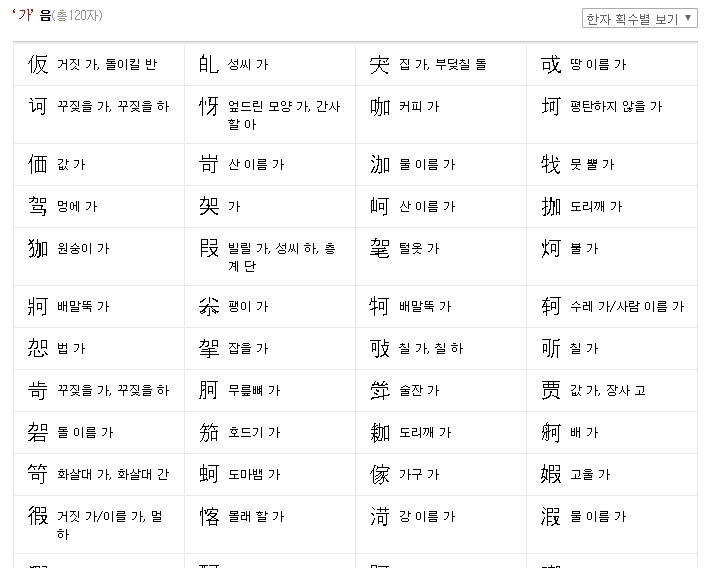 {"alt":"음으로 찾기 기능에서 '가'를 선택했을 때 나타나는 다양한 한자 목록."} 총획수(總劃數)로 한자 찾기