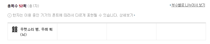 {"alt":"총획수 52획에 해당하는 '우렛소리 병' 한자를 검색한 결과 화면."} 모양자(模樣字)로 한자 찾기