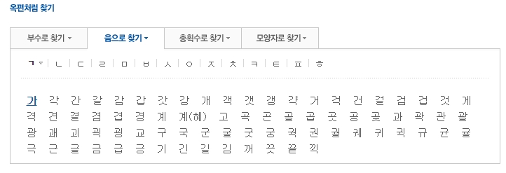 찾으려는 한자의 모양은 모르지만 소리, 즉 음(音)을 알고 있을 때 매우 유용한 방법입니다. 예를 들어 '가'라는 소리를 가진 한자를 찾고 싶다면, 음으로 찾기에서 자음 'ㄱ'을 선택하고 '가'를 클릭하면 됩니다.