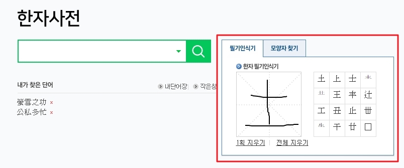 지금까지 소개한 방법들이 복잡하게 느껴진다면, 필기 인식 기능을 활용하는 것이 가장 좋습니다. 마우스나 손가락으로 모르는 한자를 직접 그려서 찾는 방식으로, 한자에 대한 사전 지식이 전혀 없어도 누구나 쉽게 이용할 수 있습니다.