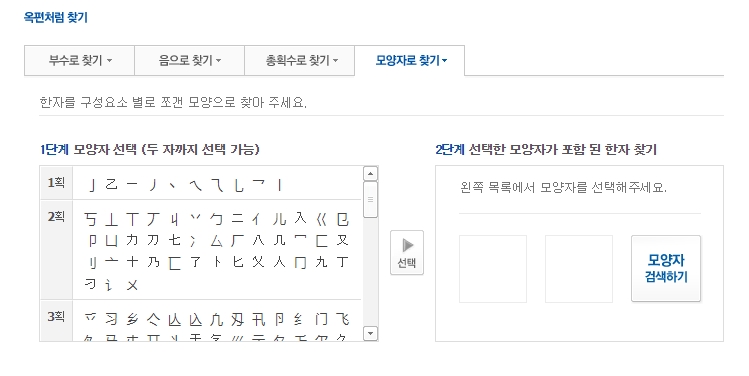 요즘은 종이 옥편 대신 네이버 한자사전과 같은 온라인 서비스를 이용하면 훨씬 간편하게 한자를 찾을 수 있습니다. 화면을 보면 알 수 있듯이, 전통적인 옥편 한자 찾기 방법인 부수, 음, 총획수, 모양자별 검색 기능을 모두 제공하여 누구나 쉽게 접근할 수 있도록 만들어져 있습니다.