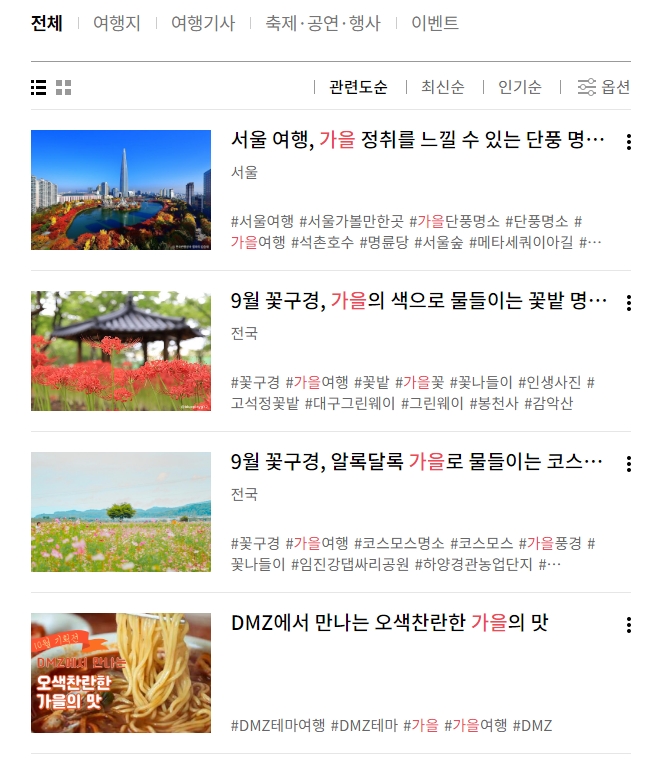 더욱 간편한 방법을 원하신다면, 웹사이트 우측 상단에 있는 검색창을 활용해 보세요. '가을'이나 '단풍' 같은 핵심 단어로 검색하면 관련된 모든 정보가 보기 쉽게 나타납니다. 현재 진행 중인 축제나 행사 정보부터 시작해서 다른 여행자들이 추천하는 숨은 명소까지, 다채로운 결과물을 얻을 수 있습니다.