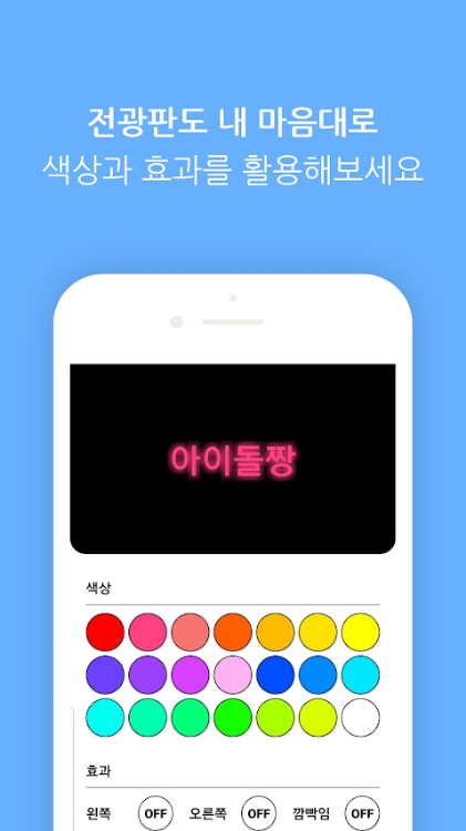 물론 이 앱에도 일반적인 텍스트 전광판 기능이 포함되어 있습니다. 하지만 이 앱의 진짜 매력은 역시 응원봉 기능이죠. 스마트폰을 흔들면 진짜 응원봉처럼 반짝이는 효과를 즐길 수 있습니다.