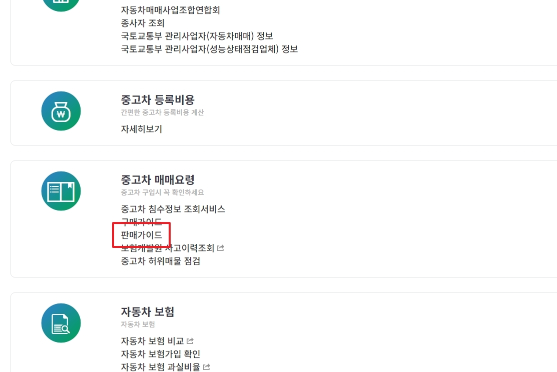 중고차 매매 항목으로 들어가면 '판매가이드'를 찾을 수 있습니다. 여기서는 차를 팔기 전에 꼭 확인해야 할 점들을 순서대로 알려줍니다. 예를 들어, 내 차의 정확한 상태를 파악하는 방법이나 시세를 알아보는 요령 등이 포함되어 있습니다.