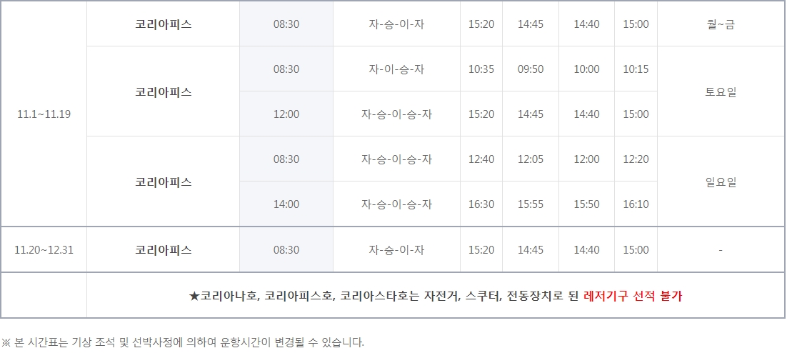 시간표를 자세히 보니까 하루에 1회 또는 2회 운항이 기본이더라고요. 육지처럼 배가 자주 있는 게 아니에요. 특히 하루 1회만 운항하는 날이 꽤 많아요.