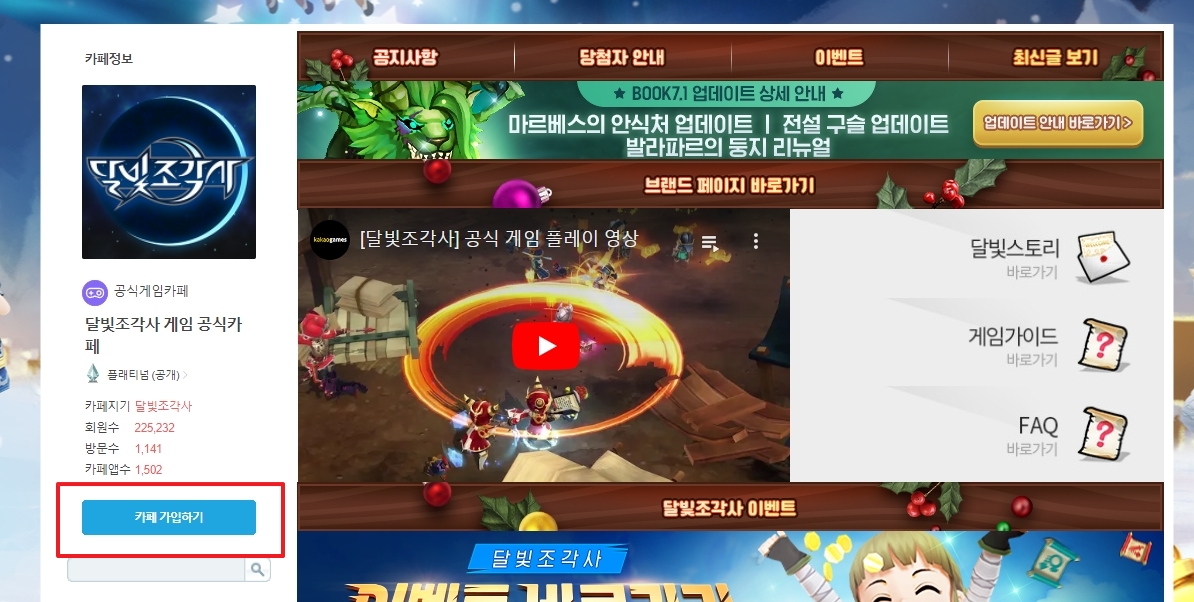 검색 결과가 나왔네요. 맨 위에 '달빛조각사 공식카페'라고 뜨는 게 보이죠? 보통 '공식카페' 마크가 붙어있는 곳이 해당 게임이나 브랜드에서 직접 운영하는 곳이니 참고하세요.