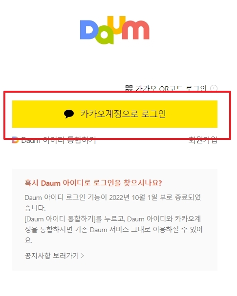 카페에 들어가거나 글을 쓰려면 로그인이 필수겠죠? 예전에는 다음 아이디를 썼지만, 지금은 보시다시피 '카카오계정으로 로그인' 버튼이 크게 떠요. 다음이랑 카카오가 합병되면서 계정이 통합됐기 때문이에요.